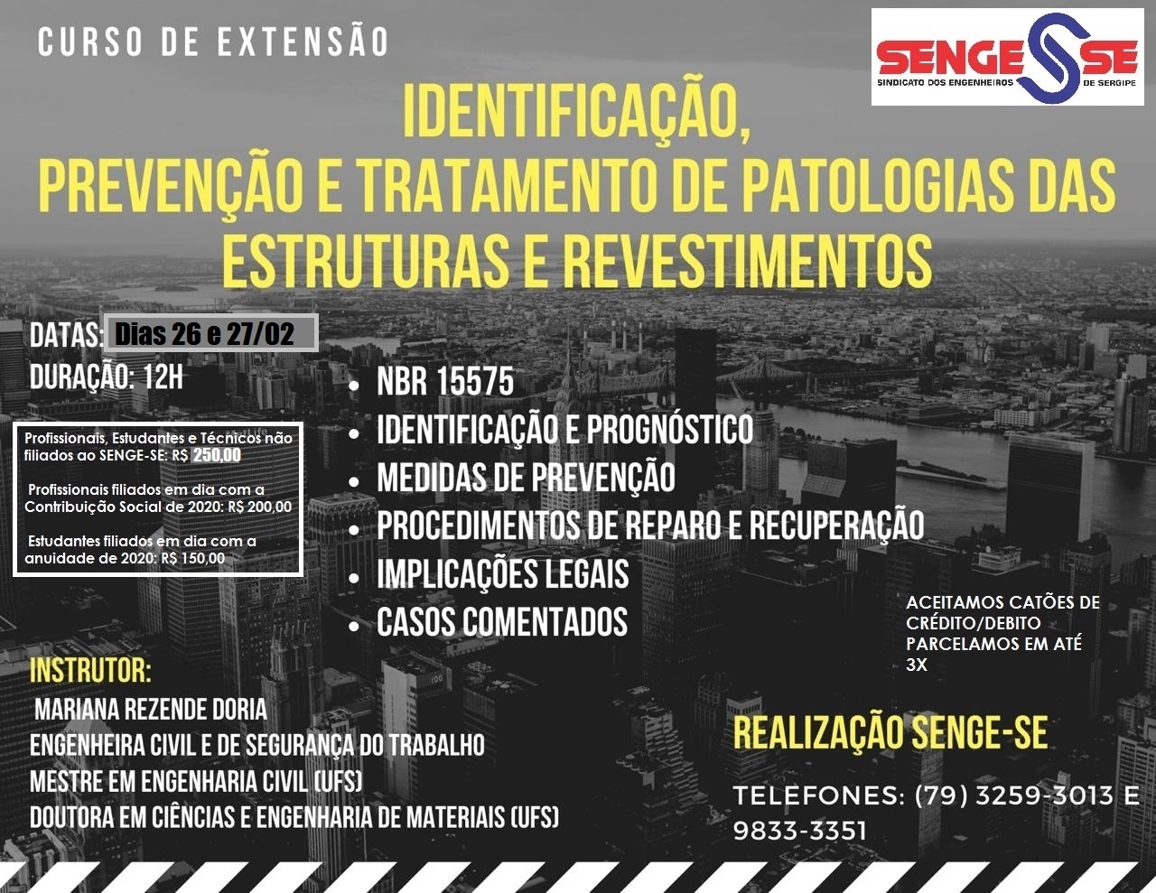PUBLICO ALVO: Engenheiros, Arquitetos, Técnicos, Estudantes, Profissionais da Área da Construção Civil, Síndicos, Gestores Prediais e Profissionais envolvidos com a manutenção predial. INSTRUTORA DO CURSO: Dsc. MARIANA REZENDE DORIA, Engenheira Civil; pós-graduada em Engenharia de Segurança do Trabalho; Mestra em Engenharia Civil pela UFS, com tema de dissertação “Aderência concreto-concreto e aço-concreto em recuperação de estruturas de concreto armado”; Doutora em Engenharia de Materiais com o tema da tese sobre mecanismos de detecção e mitigação da Reação Álcali-Agregado; Experiência com gestão de obras e projetos complementares; Atualmente é professora do curso de Arquitetura e Urbanismo da Universidade Federal de Sergipe e Analista legislativo (Engenharia civil) da Assembleia Legislativa do Estado de Sergipe.